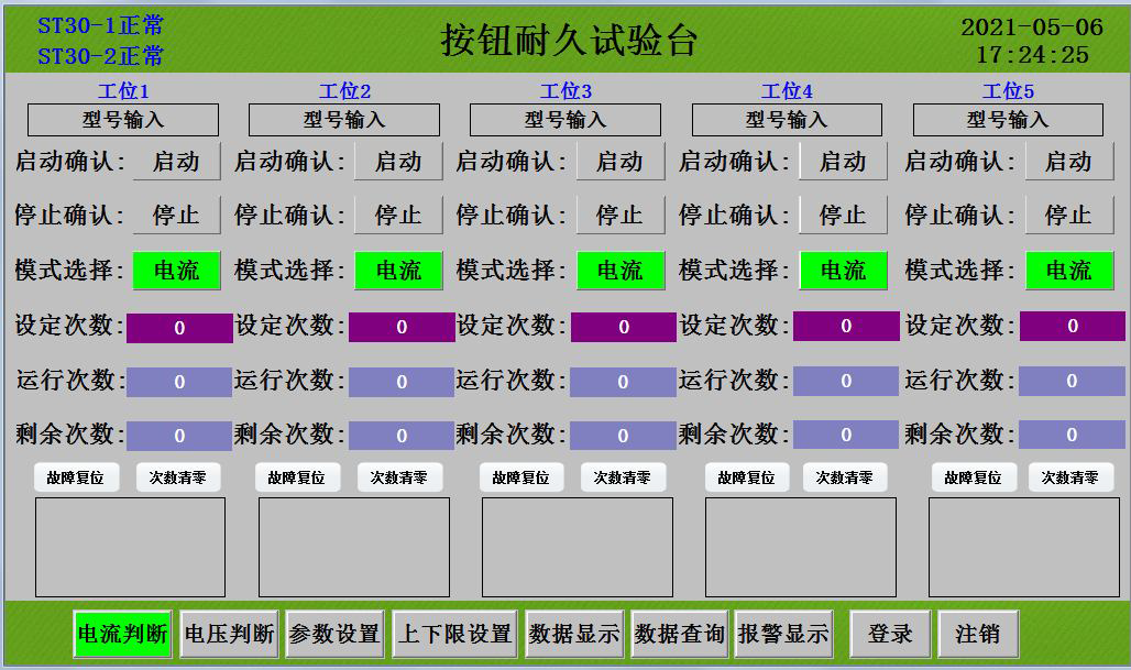 本按钮开关寿命测试台,可设多个工位,每个工位均设有推压工装(或电容笔),在PLC及变送器的精确控制下,以一定的行程及推力,对水平放置的按钮进行按压寿命测试。